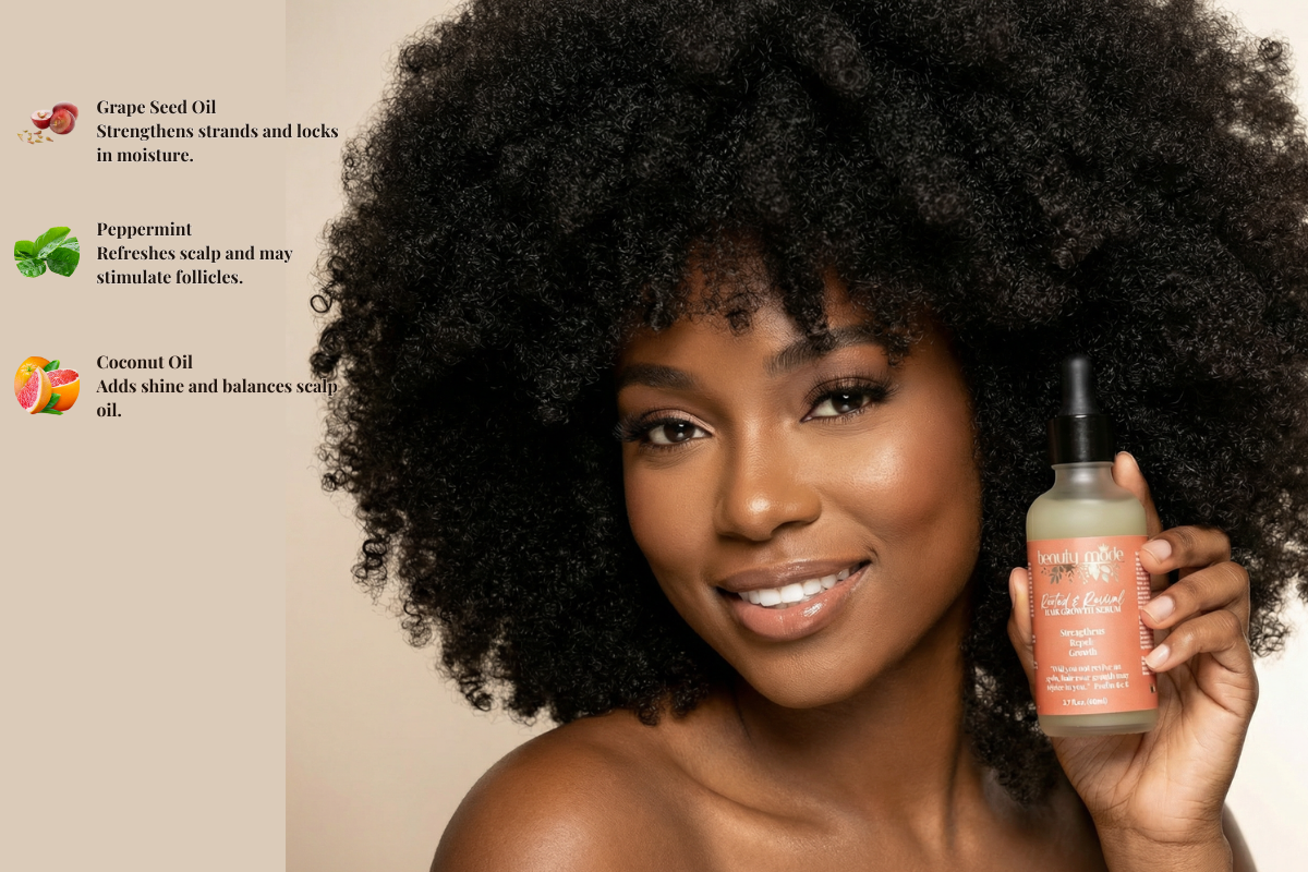 Apply directly to the scalp and hair. Gently massage in until absorbed. Use nightly as part of your self-care and hair growth journey.
